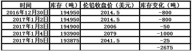 12月30日至1月5日伦铅维持在2000-2100间维持震荡,伦铅在底部2000美元处获得支撑后触底反弹,最高达2085。本周库存累计减少2675吨。